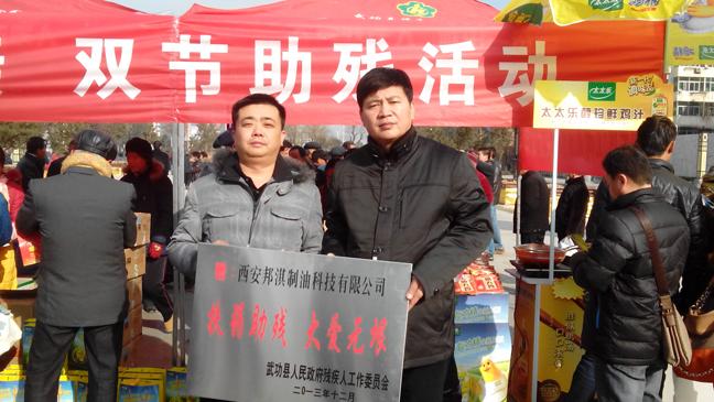 為表達(dá)石羊“邦淇人”對(duì)武功2.8萬(wàn)殘疾人的關(guān)愛(ài)之情,元月1日到3日,邦淇小包總公司聯(lián)合武功縣殘疾人聯(lián)合會(huì)、陜通配送中心在縣中心廣場(chǎng)聯(lián)合舉辦“扶弱助殘獻(xiàn)愛(ài)心、饋贈(zèng)武功眾鄉(xiāng)親”活動(dòng),此次活動(dòng)得到了油脂事業(yè)部王曉勇副總經(jīng)理的大力支持,公司提供邦淇1.8L一豆300余桶、價(jià)值5000元,現(xiàn)場(chǎng)給重度殘疾人代表免費(fèi)發(fā)放。武功殘聯(lián)理事長(zhǎng)秦喜、邦淇小包西區(qū)總經(jīng)理張帆、陜通配送中心經(jīng)理何凱及市場(chǎng)部有關(guān)人員共同參加。張總代表公司發(fā)表了熱情洋溢致辭,他首先感謝武功父老長(zhǎng)期對(duì)“邦淇”的支持,然后簡(jiǎn)要介紹了集團(tuán)及油脂產(chǎn)業(yè)的基本情況,最后表達(dá)了對(duì)武功殘疾人朋友的深切關(guān)愛(ài),博得了現(xiàn)場(chǎng)群眾的由衷稱(chēng)贊。在熱烈的掌聲中,殘聯(lián)領(lǐng)導(dǎo)將一面寫(xiě)有“扶弱助殘、大愛(ài)無(wú)垠”的銅牌授予邦淇公司。