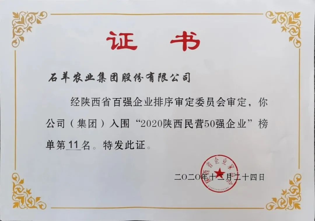 石羊集團(tuán)榮膺2020年“陜西百?gòu)?qiáng)企業(yè)”、“陜西民營(yíng)50強(qiáng)企業(yè)”稱號(hào),分別排名48位和11位,集團(tuán)營(yíng)業(yè)收入持續(xù)增長(zhǎng)。